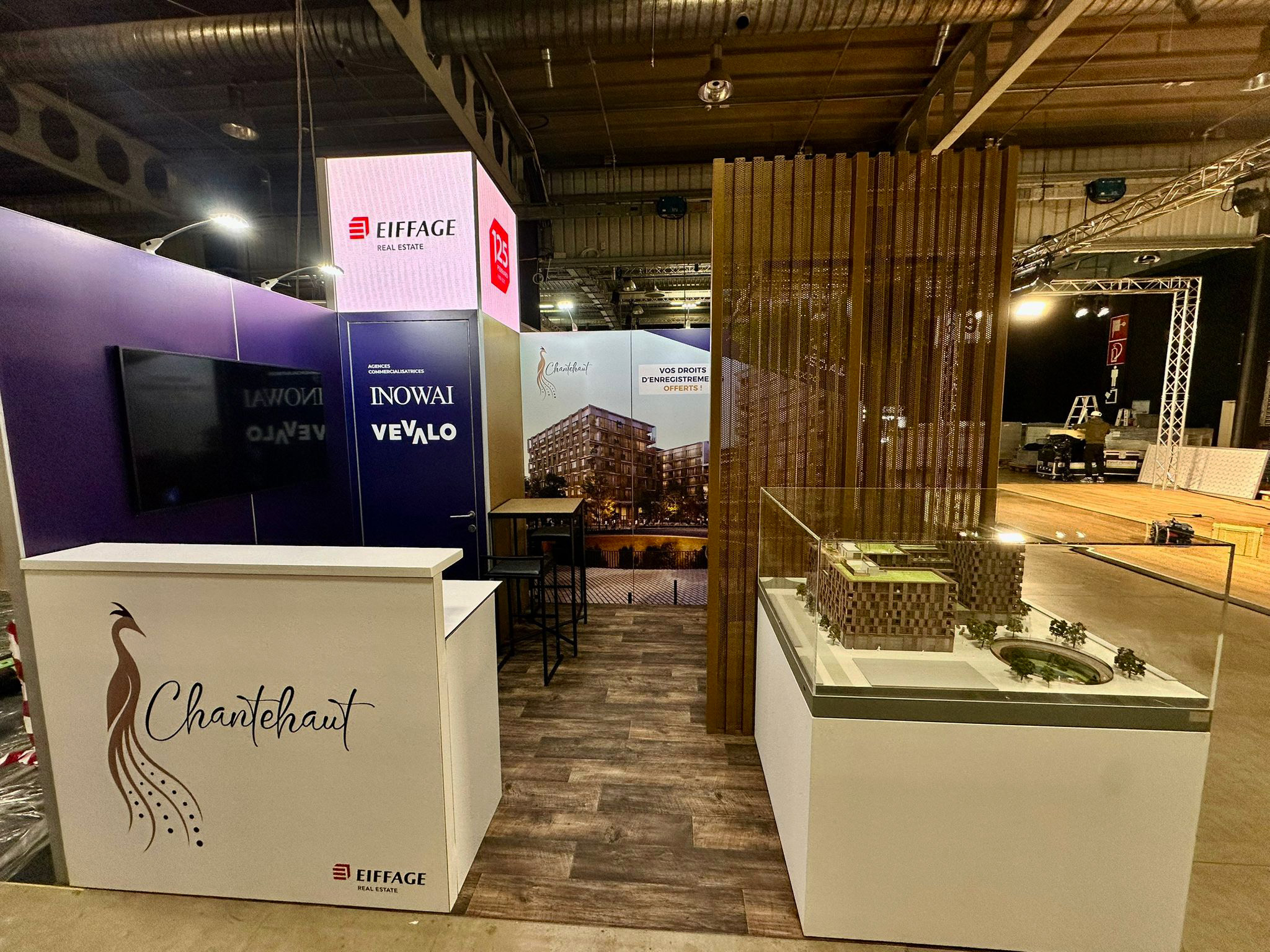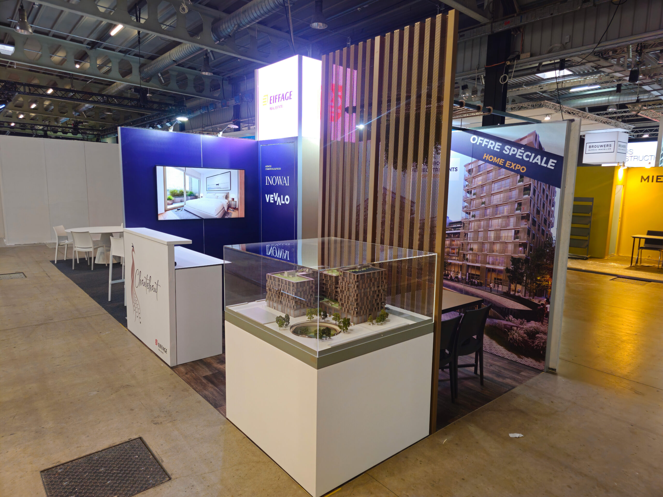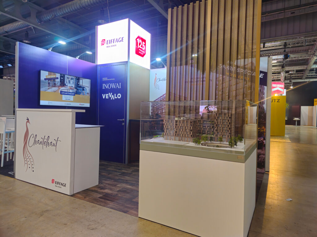 At the Home Expo in Luxembourg, we created an exhibition stand combining modernity, warmth, and visual impact. The stand featured an LED screen for dynamic communication, immediately capturing visitors’ attention. The floor was covered with vinyl perfectly mimicking a parquet floor effect, bringing a warm and elegant ambiance to the entire space.