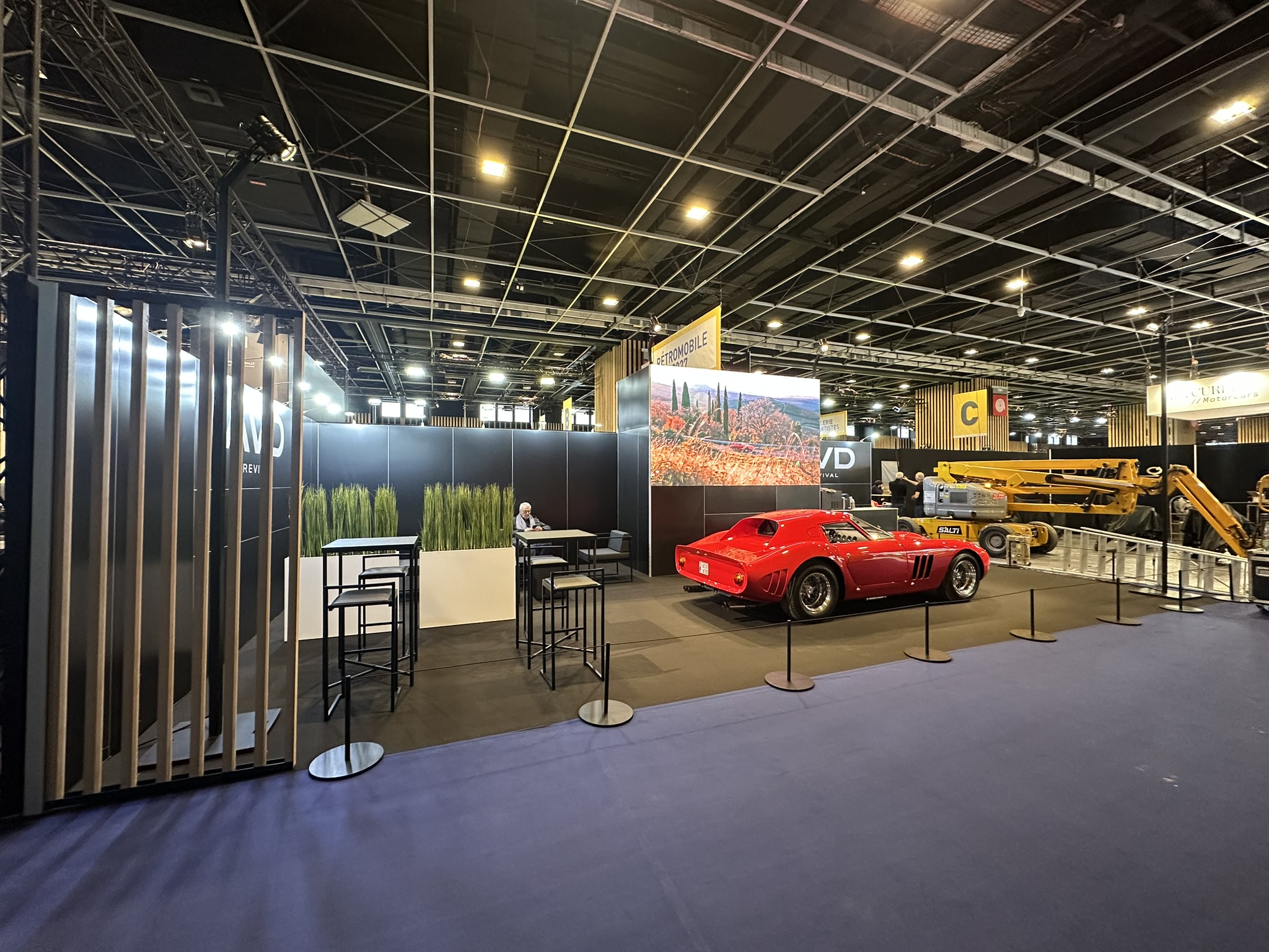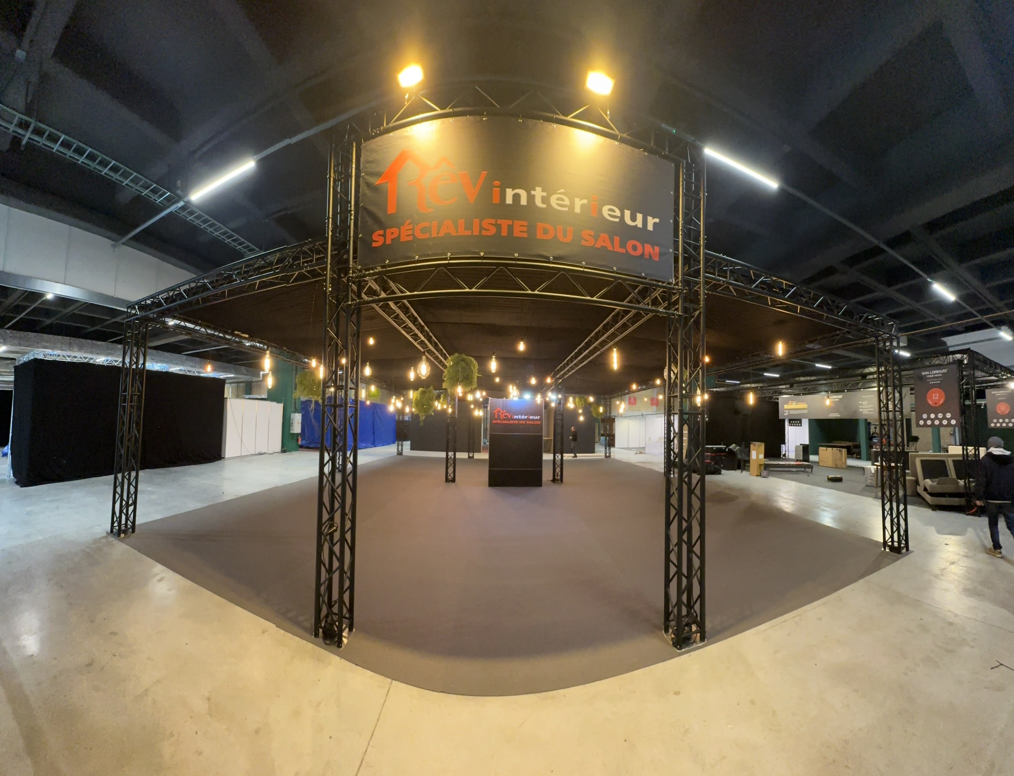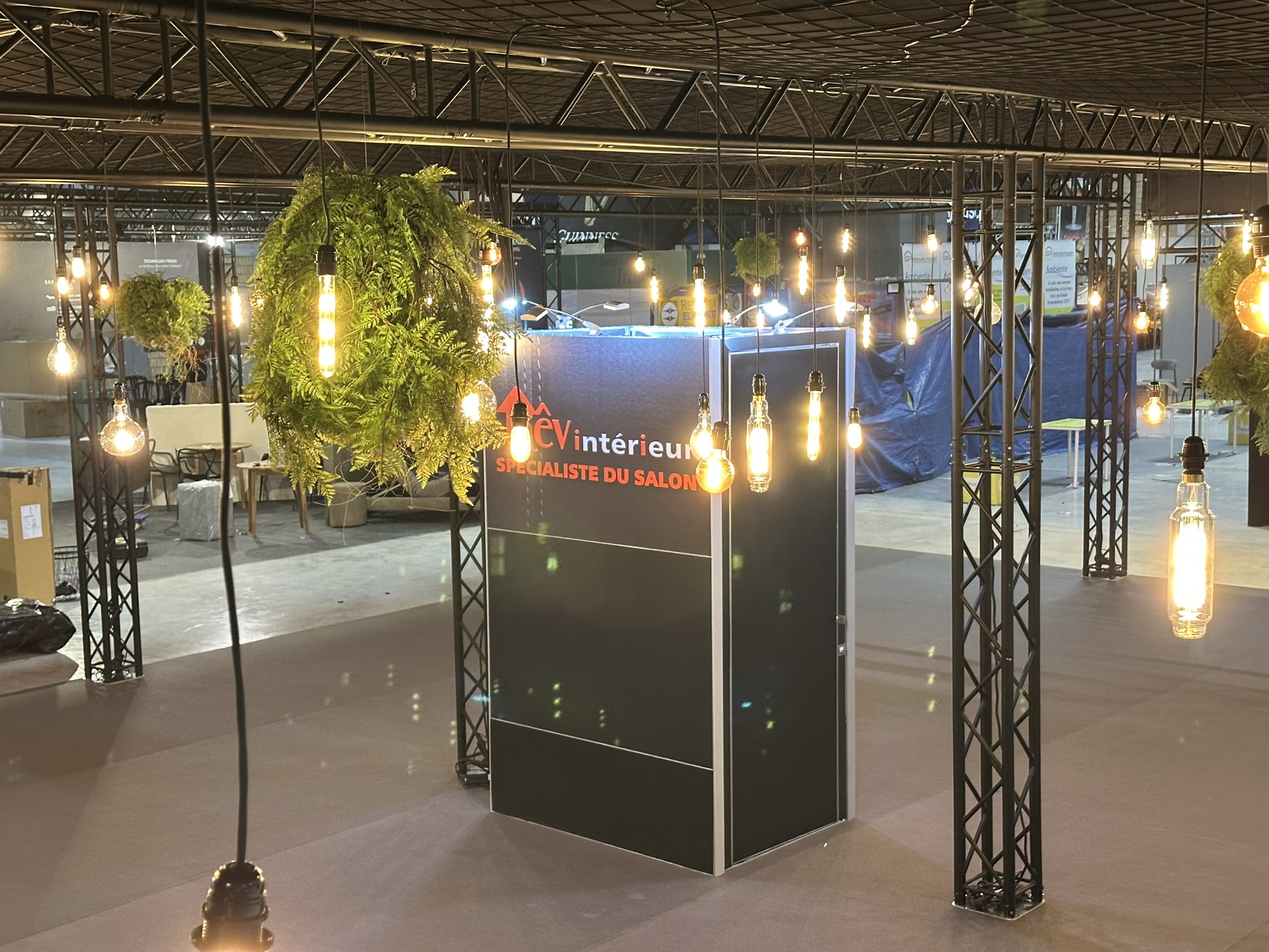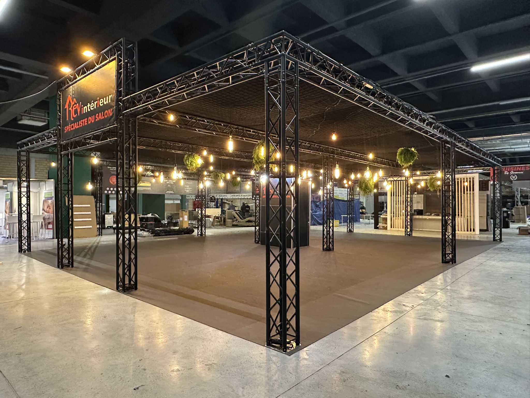 Additionally, we built a functional storage area integrated into the structure. This allowed for discreet and practical storage. Above it, a giant LED screen immediately caught the eye. Thanks to this central element, the turnkey stand had a strong visual impact, visible from a distance.