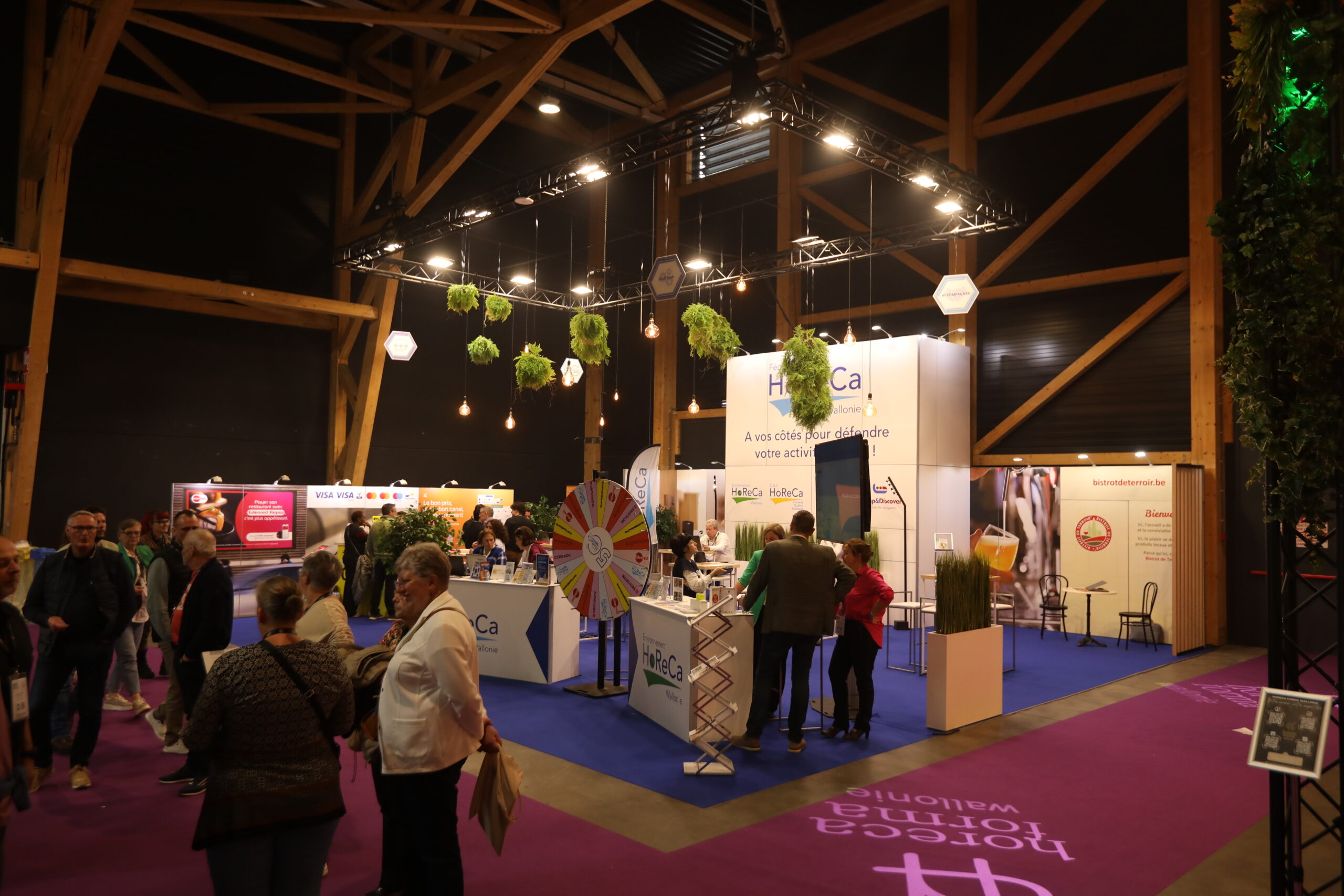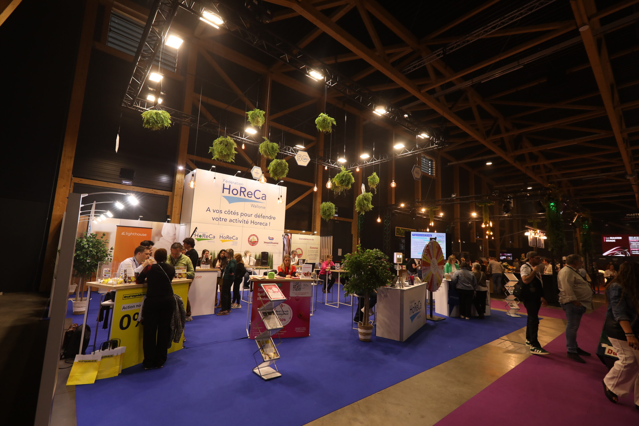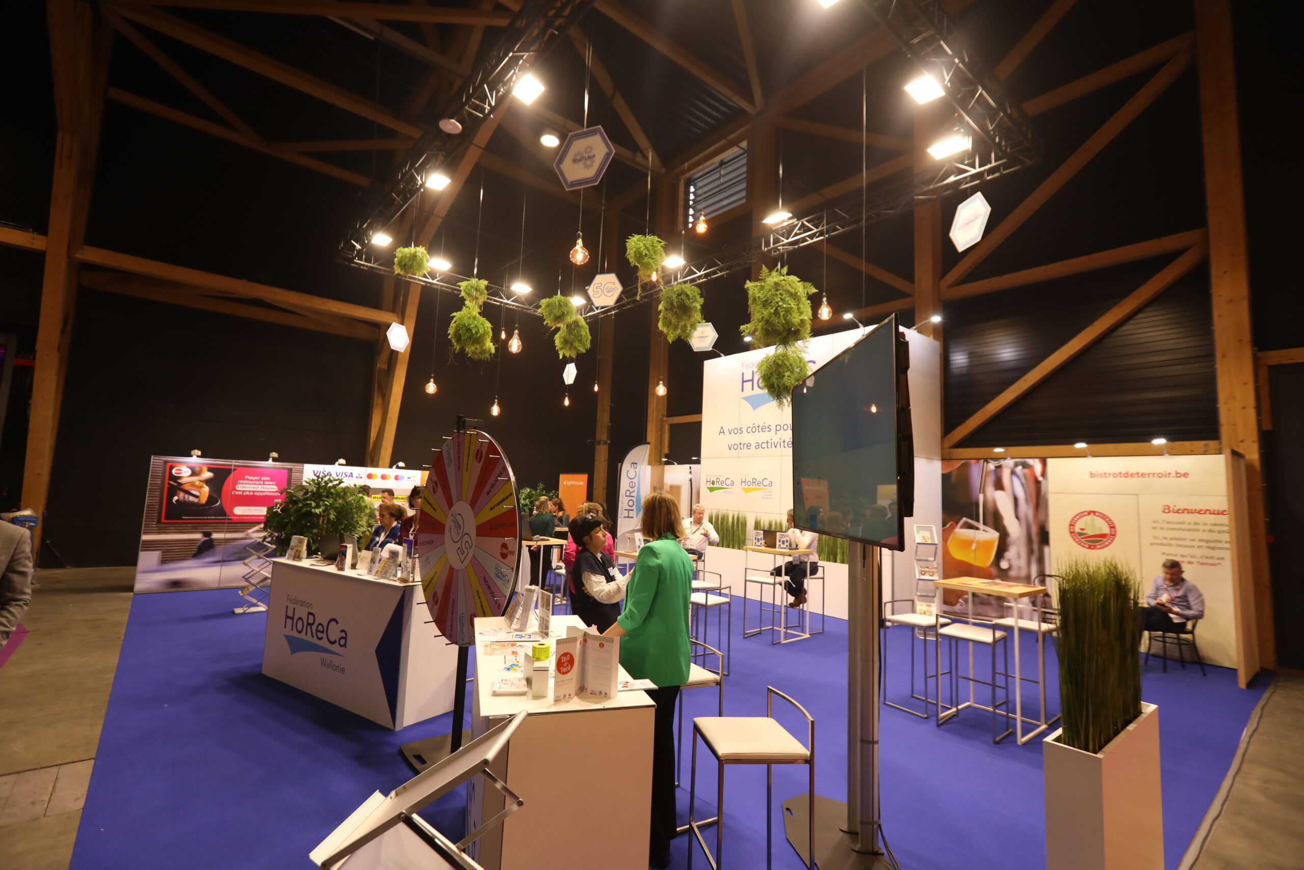 To enhance the attractiveness of the exhibition stand, several visual and interactive elements were integrated. A colorful wheel of fortune immediately caught visitors’ attention and created a fun animation around the stand. This type of installation increases audience engagement while encouraging exchanges with HORECA Federation representatives.