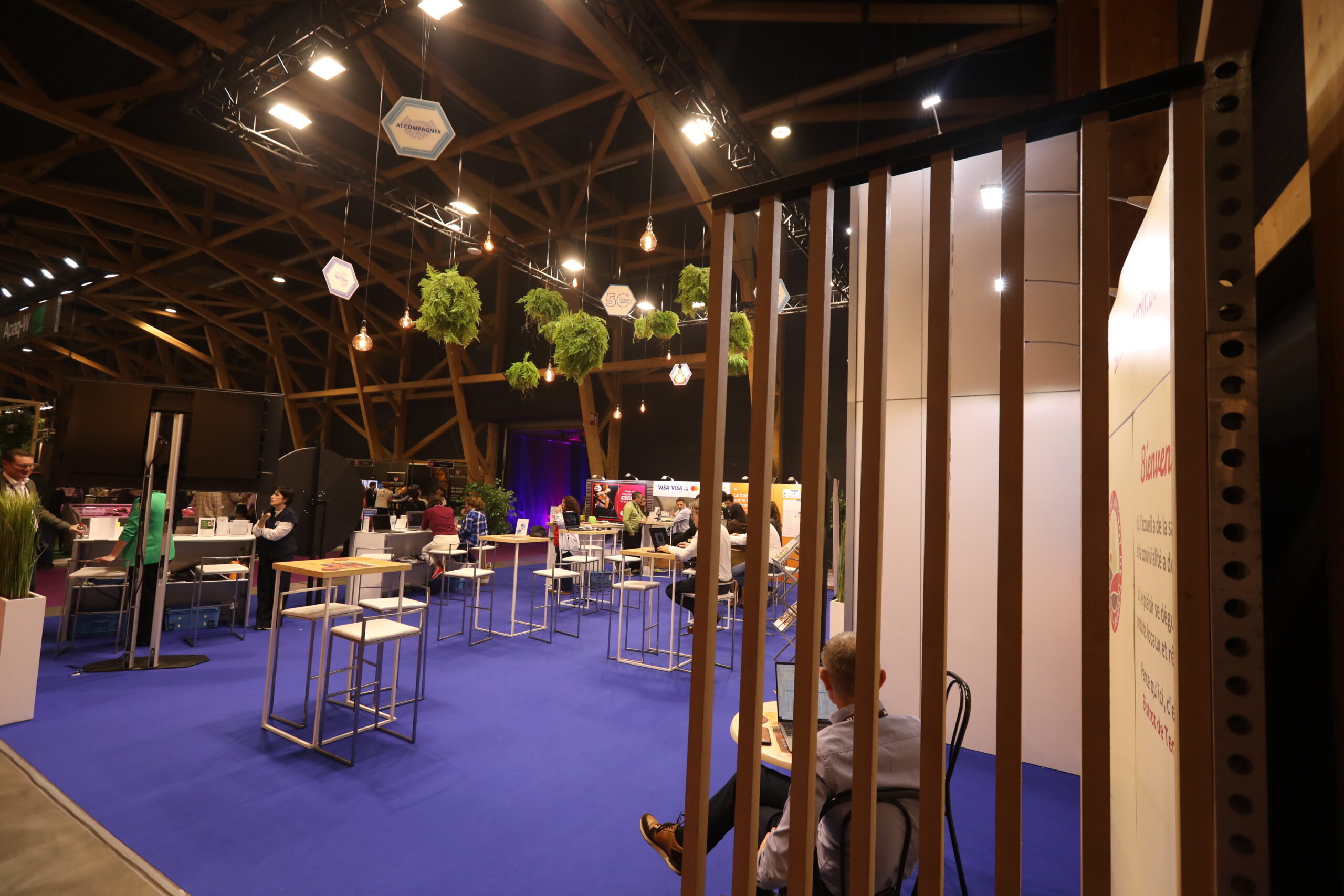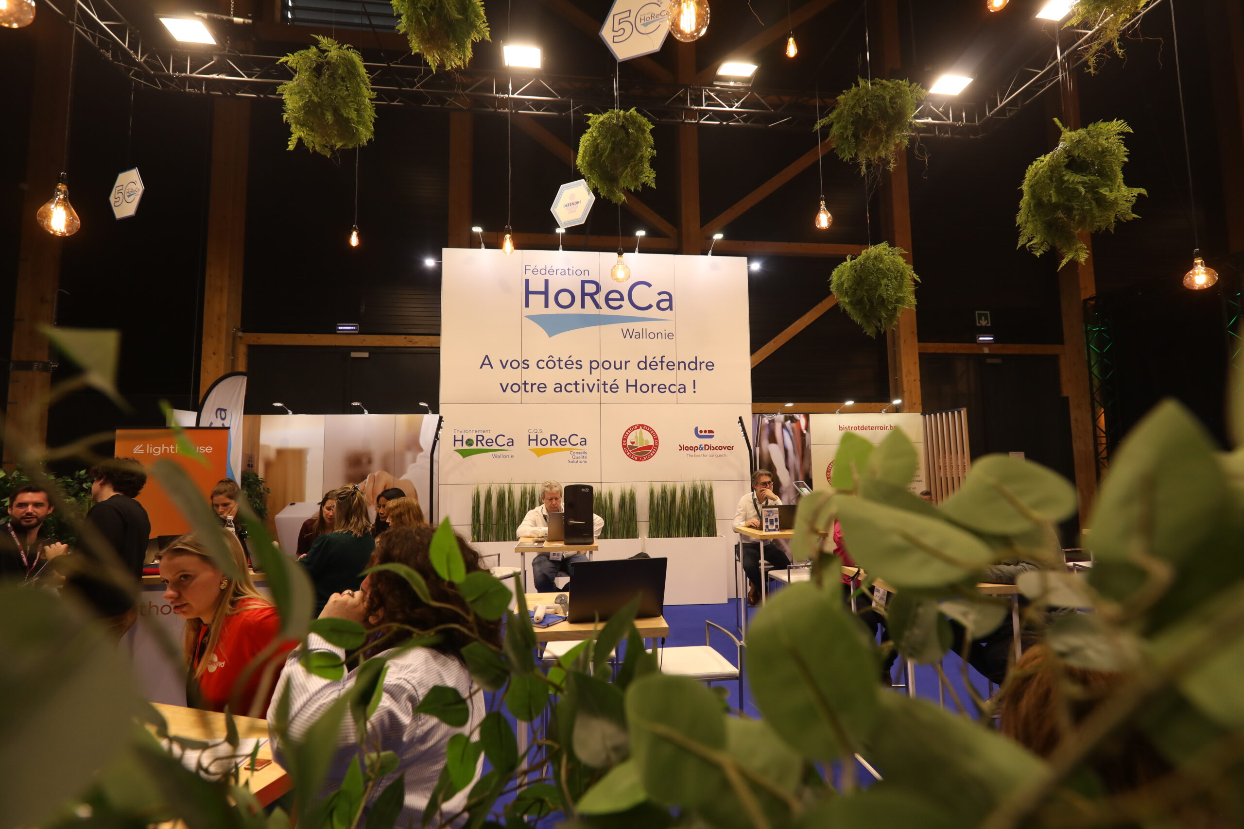 The space was also decorated with vintage-style light bulbs, creating a warm and friendly atmosphere perfectly suited to the horeca world. A custom desk showcased the various partners involved in the project. This achievement demonstrates how a well-designed exhibition stand design can transform a space into a true professional meeting point at a major trade show like Horecatel.